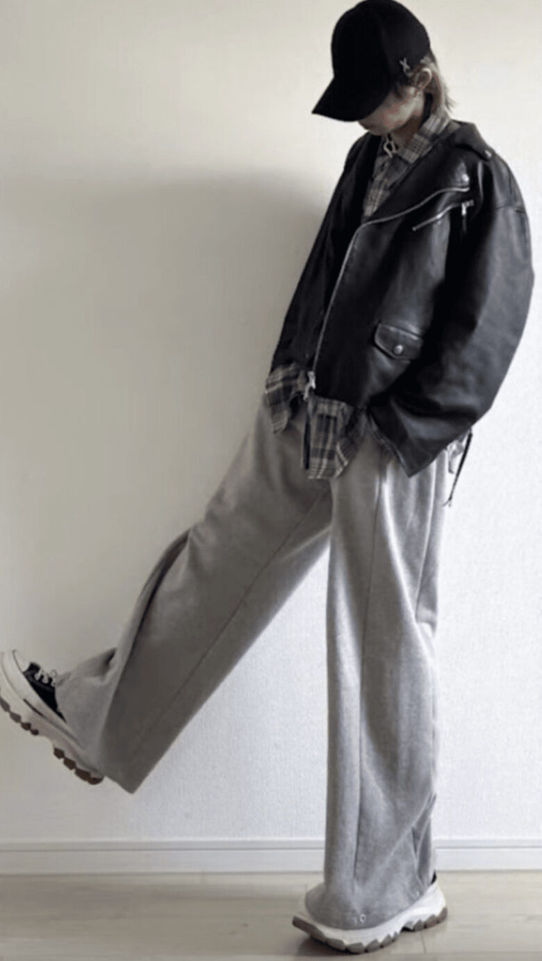 スウェットパンツ、スニーカーのコーデになります。